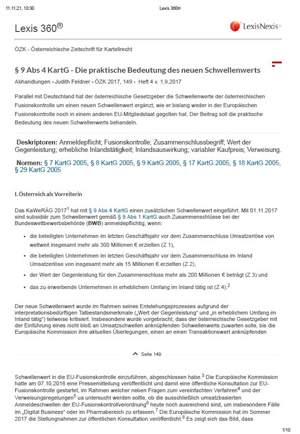Original title: § 9 Abs 4 KartG – Die praktische Bedeutung des neuen Schwellenwerts