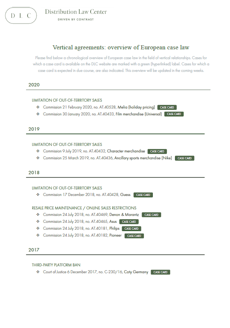 The Distribution Law Center has compiled a chronological overview of European case law in the field of vertical relationships. Cases for which a case card is available on the DLC website are marked with a green (hyperlinked) label. Cases for which a case card is expected in due course, are also indicated. This overview will be updated in the coming weeks.